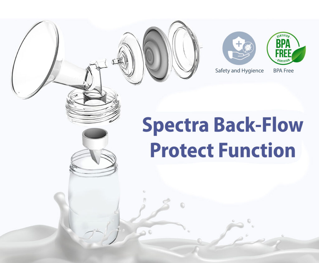 ระบบป้องกันน้ำนมไหลย้อน จะช่วยป้องกันการติดเชื้อในน้ำนมและทำให้มั่นใจได้ว่านมที่ปั้มออกมาสะอาดและปลอดภัยสำหรับทารกเอกสิทธิ์ของสเปคตร้าเจ้าเเรกในโลก
